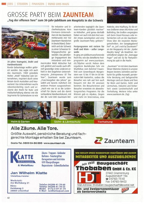 Runde Geburtstage wollen gefeiert werden. Das sagte sich auch das Zaunteam. 1989 gründete Walter "Wädi" Hübscher sein Unternehmen, inpsiriert durch seine Reise durch Australien und Neuseeland. Das Unternehmen wuchs rekordverdächtig rasch und eroberte den Markt für Nutz- und Hobbytierhaltung ebenso wie die Segmente für Gartenzäune so wie für Industrie- und Sicherheitszäune.